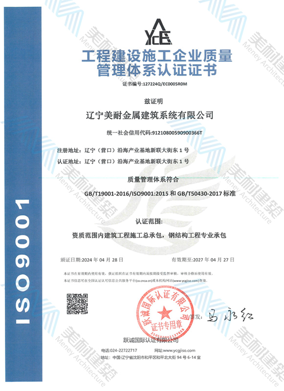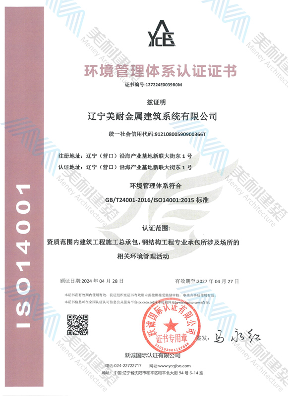 遼寧美耐金屬建筑系統(tǒng)有限公司位于遼寧(營口)沿海產(chǎn)業(yè)基地,專注于預制金屬建筑系統(tǒng)領域,是一家集工業(yè)建筑設計、制作、施工及相關的技術咨詢與服務為一體的綜合性服務企業(yè)。作為國家鋼結構協(xié)會會員、中國建筑金屬結構協(xié)會會員單位與國家高新技術企業(yè),美耐建筑集建筑工程施工總承包、鋼結構工程專業(yè)承包等多種資質于一身,并擁有22項鋼結構建筑領域專利,9項軟件著作權。